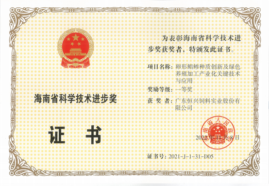 恒兴股份获得 2021年度海南省科技进步奖一等奖