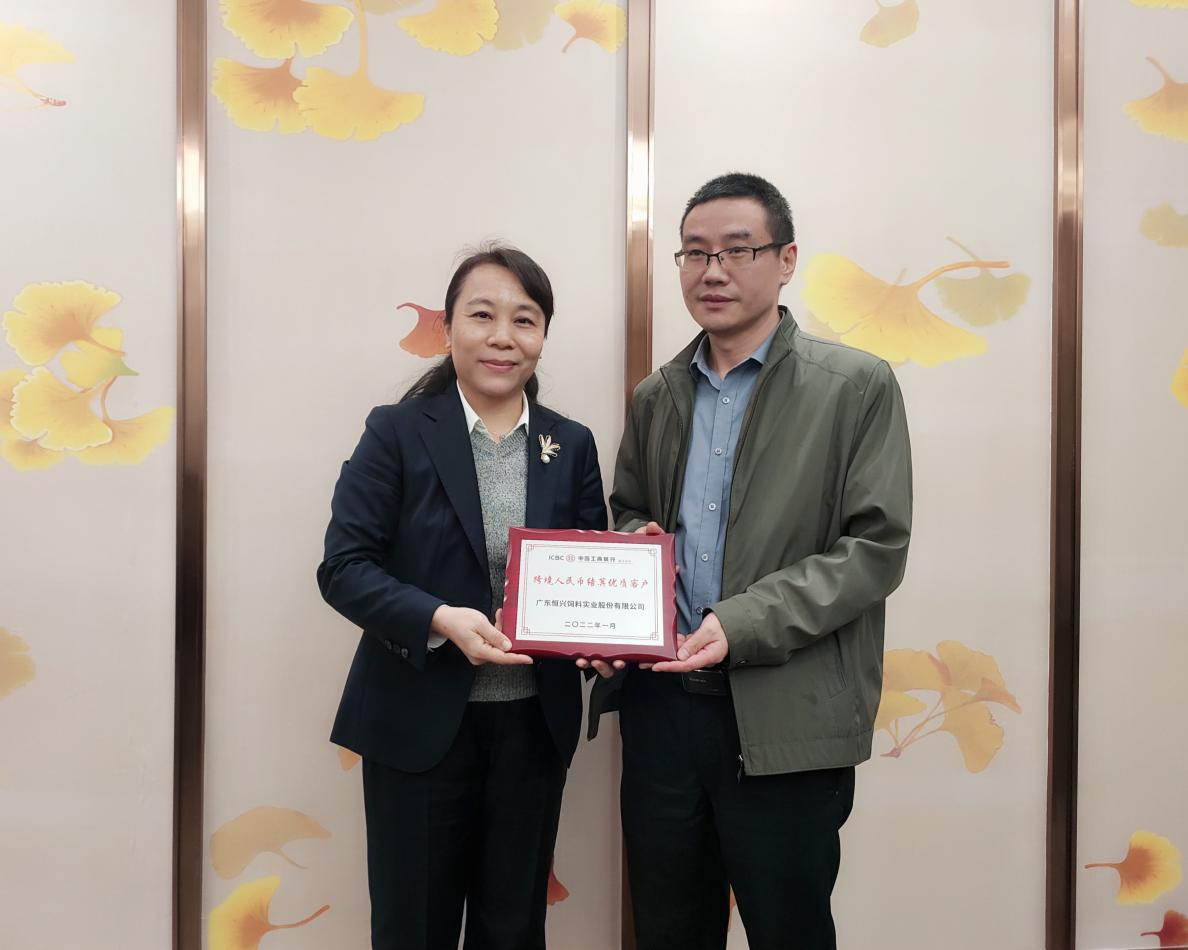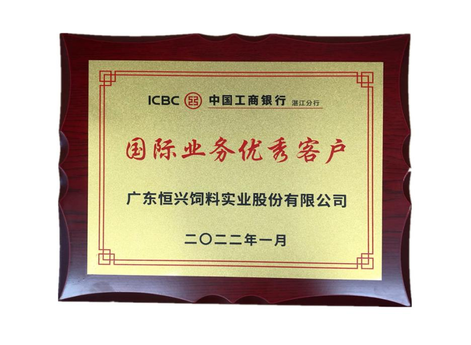 中国工商银行股份有限公司湛江分行潘德亮副行长向恒兴颁发“国际业务优秀客户”牌匾