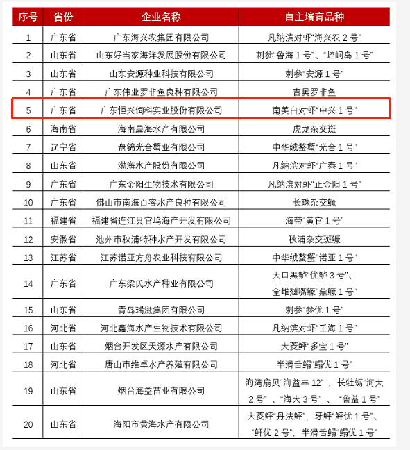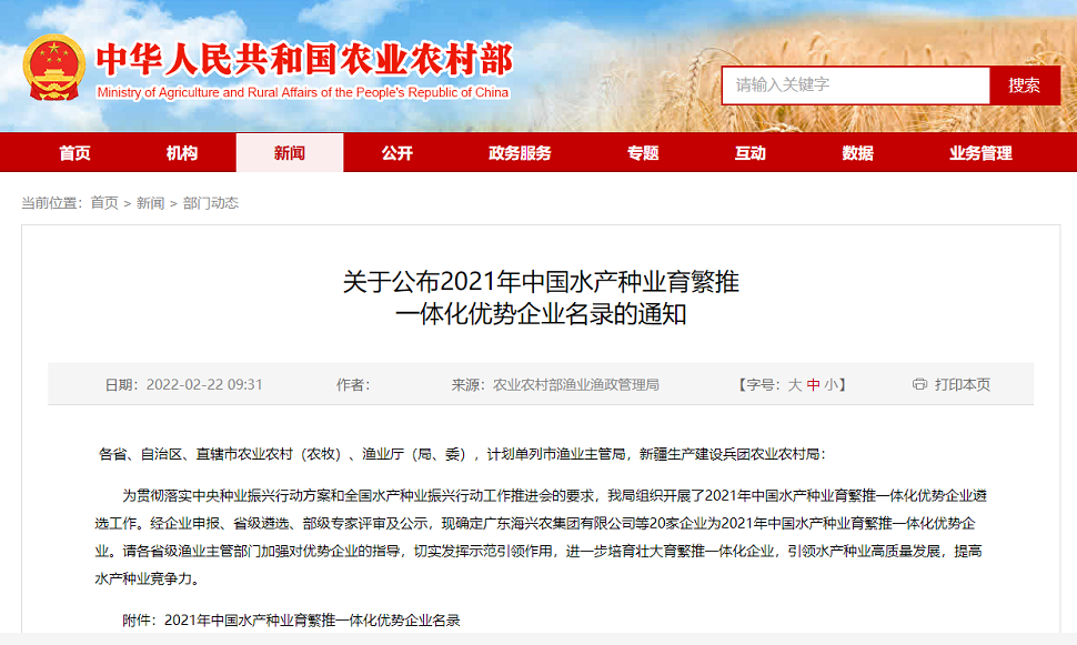 2月21日,农业农村部渔业渔政管理局印发《关于公布2021年中国水产种业育繁推一体化优势企业名录的通知》,公布了2021年中国水产种业育繁推一体化优势企业名录。公司南美白对虾“中兴1号”名列其中。